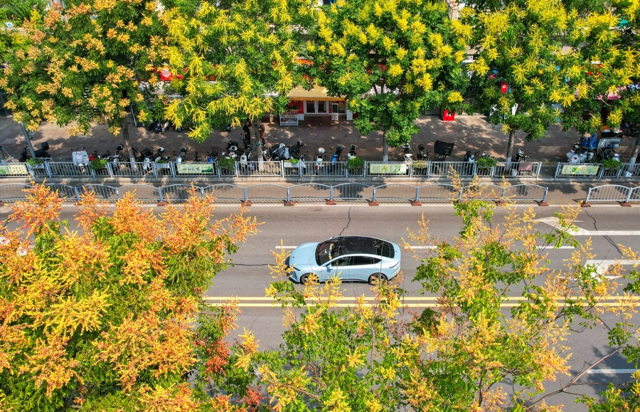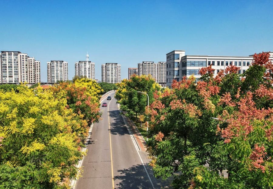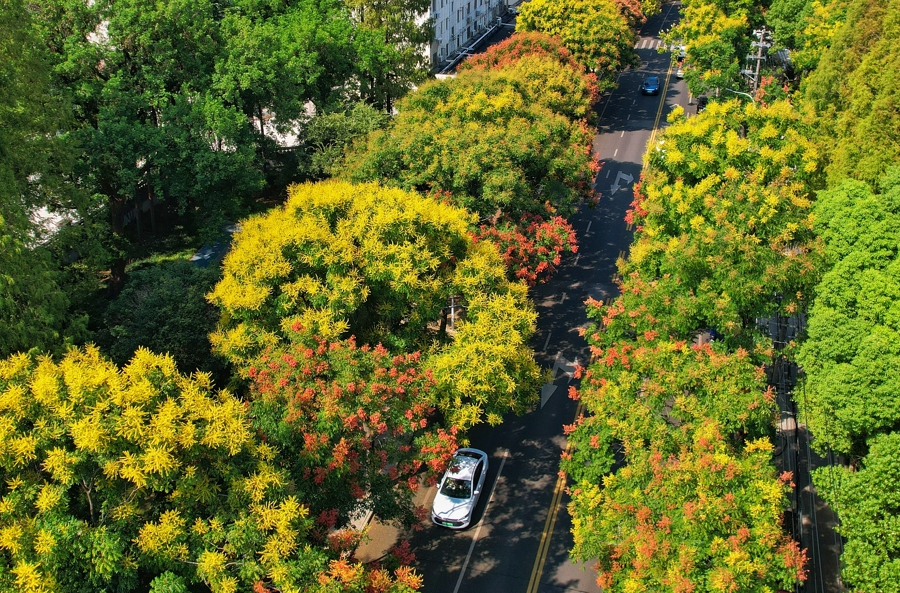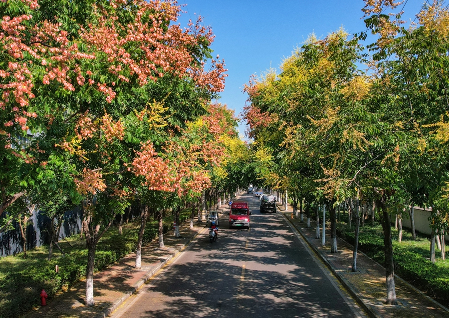 9月以来,申城的秋味渐渐浓郁起来。在松江区部分道路旁,栾树已开出了金黄的花,结出了红色果实,与绿叶交相辉映,仿佛一幅流金溢彩的秋日画卷。